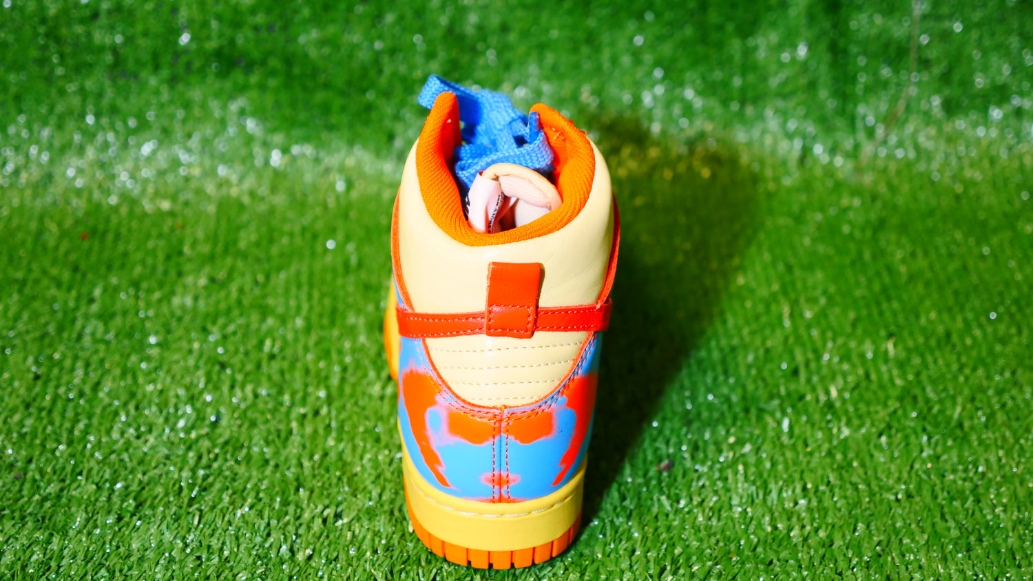 The Nike Dunk High 1985 Orange Blue features a cream leather upper with washed out orange and blue graphic overlays that offer a vintage appearance. Solid orange Swoosh overlays draw a stark contrast to their subtle background. From there, yellowed soles provide a vintage feel.