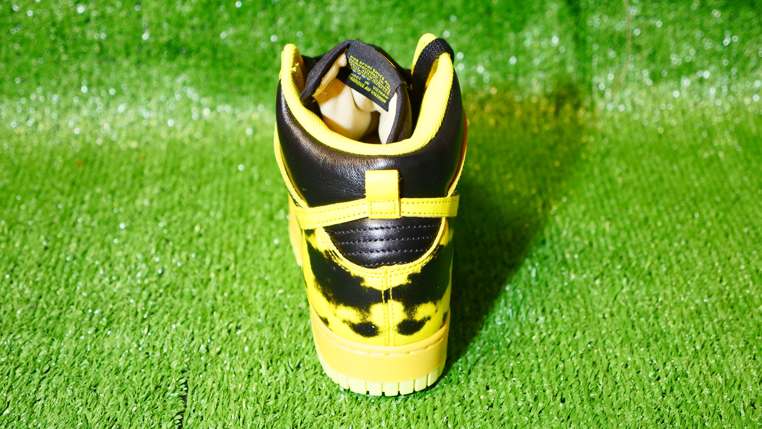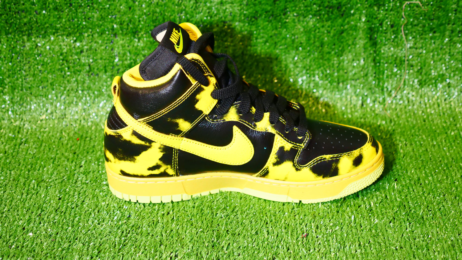 The Nike Dunk High 1985 Yellow Acid Wash celebrates the aged effects of sneakers over time. Washed out black and yellow graphic overlays emphasize the appearance of wear and tear, while yellowed soles nod to the oxidation process. Also, these Dunks arrive in the design's original, high-cut form, explaining why they have a different shape from other Dunk Highs, which have more of a mid-cut silhouette.