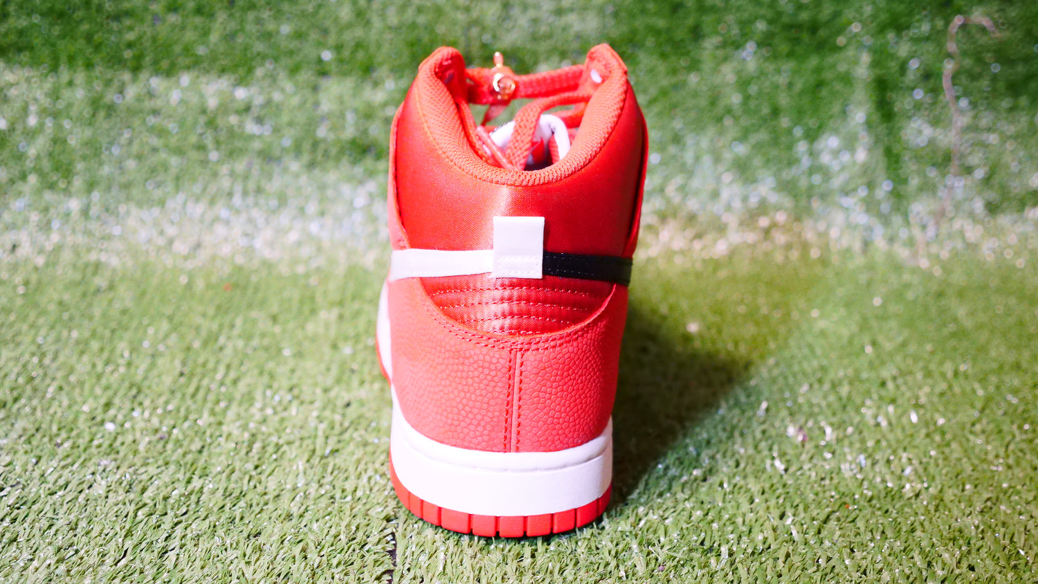 The NBA x WNBA One Game Nike Dunk High PRM boasts a design that closely mimics a basketball's appearance, with an orange smooth leather foundation and textured pebbled leather overlays for added grip and style. The tongue and collar feature a sleek satin finish, while the black and white Swooshes adorn the sides. Inside, you'll find NBA and WNBA co-branding discreetly placed on the reverse side of the tongue tag. The midsoles are crisp white, and the outsoles are colored in a vibrant basketball-orange hue, completing the sporty aesthetic of this footwear.
